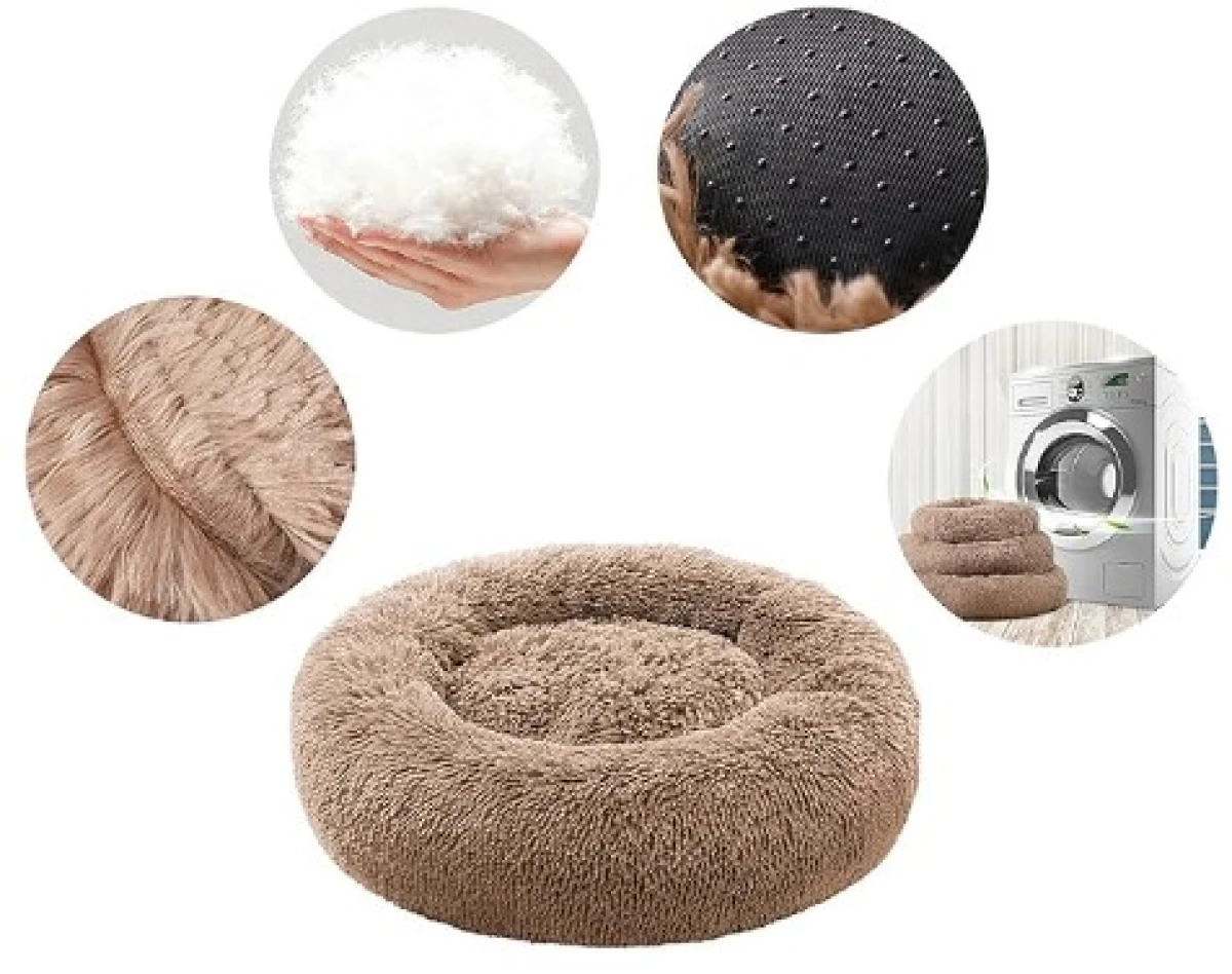 El diseño del donut es muy adecuado para perros y gatos a los que les gusta acurrucarse mientras duermen. Los bordes elevados pueden crear una sensación de seguridad y brindar apoyo para la cabeza y el cuello, lo que alivia el dolor muscular y articular de la mascota.