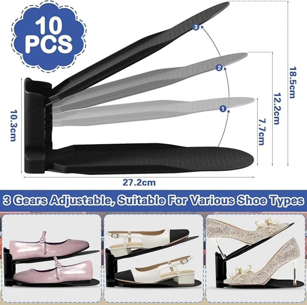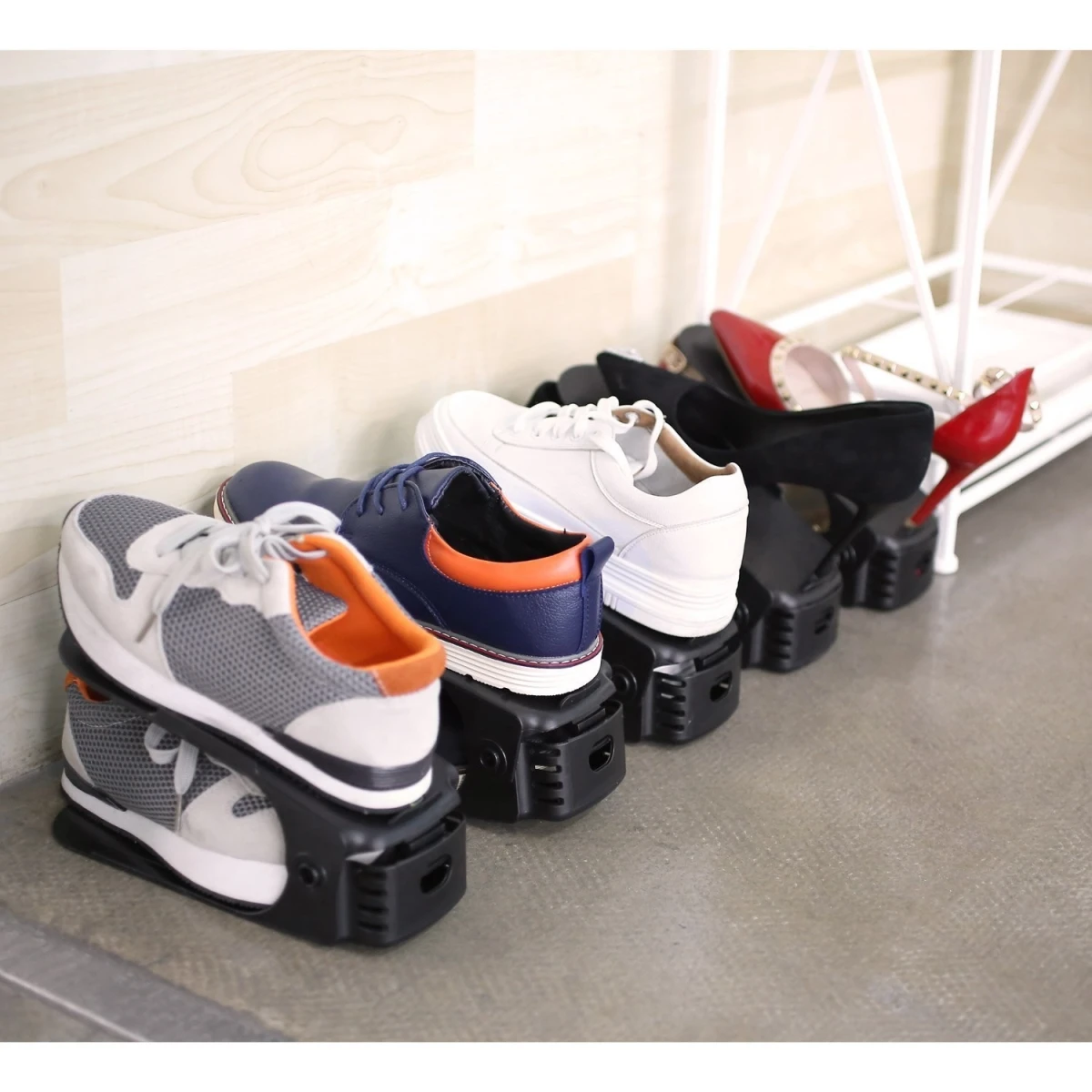 - Ahorro de espacio: Organizadores Ajustables de Zapatos un zapatero dividido en dos niveles ahorra mucho espacio. También ahorra espacio al evitar que los zapatos se aprieten, ya que pueden quedar torcidos. Es fácil de guardar y no ocupa mucho espacio.