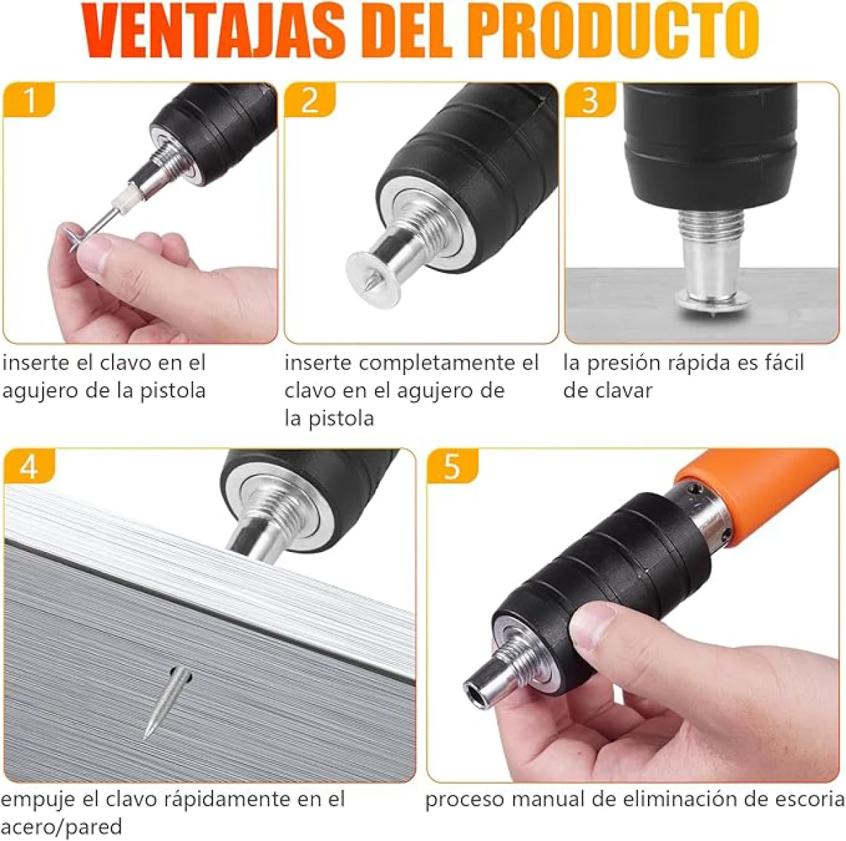 - 【Entrega】- 1 Pistola de clavos, 200 clavos redondos, 1 Caja de plástico, 1 par de guantes, 1 par de gafas, 1 tapón para los oídos, 1 llave, 1 cepillo, 1 manual. Al usar herramientas de pared, use tapones para los oídos, gafas y guantes.